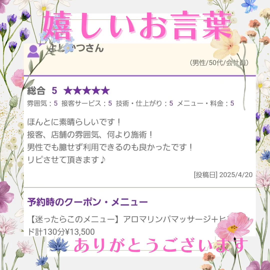 『ほんとに素晴らしいです!接客、店舗の雰囲気、何より施術!男性でも臆せず利用できるのも良かったです!