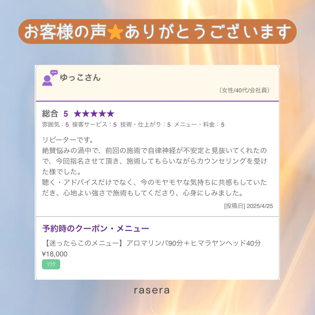 聴く・アドバイスだけでなく、今のモヤモヤな気持ちに共感もしていただき、心地よい強さで施術もしてくださり、心身にしみました】