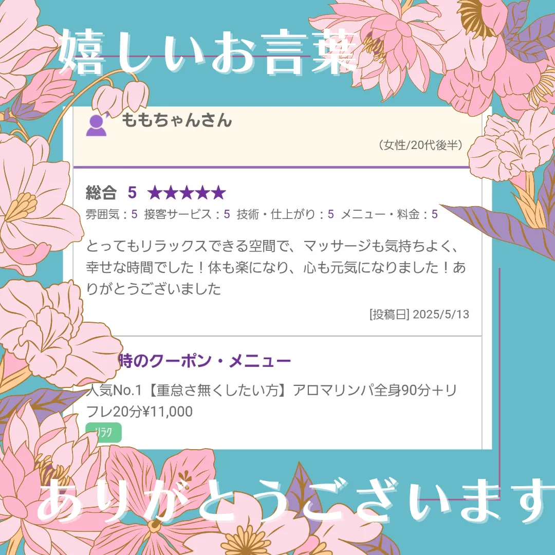 『とてもリラックスできる空間で、マッサージも気持ち良く、幸せな時間でした!体も楽になり、心も元気になりました!ありがとうございました』