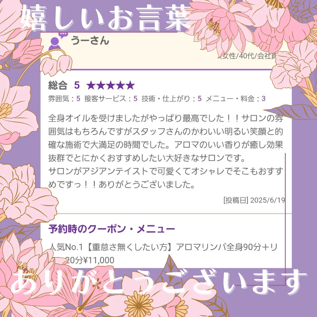 『全身オイルを受けましたがやっぱり最高でした!サロンの雰囲気はもちろんですがスタッフさんのかわいい明るい笑顔と的確な施術で大満足の時間でした。アロマのいい香りが癒し効果抜群でとにかくおすすめしたい大好きなサロンです。サロンがアジアンテイストで可愛くてオシャレでそこもおすすめですっ!!ありがとうございました。』